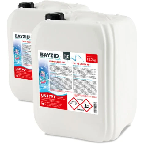 Pour une désinfection rapide de l’eau de votre piscine, il est recommandé d’avoir recours à un traitement de choc. Le chlore liquide Bayzid® a un taux de chlore actif de 13 à 16%.