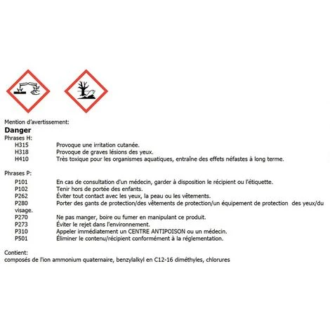 Avant toute utilisation de produits biocides, assurez-vous que celle-ci est indispensable, notamment dans les lieux fréquentés par le grand public. Privilégiez chaque fois que possible les méthodes alternatives et les produits présentant le risque le plus faible pour la santé humaine, animale et pour l’environnement. Les dosages indiqués dans ce catalogue sont indicatifs et peuvent changer en fonction des caractéristiques propres à chaque piscine, au climat, etc. L’addition de produit se réalisera de préférence en début de soirée et toujours en l’absence de baigneurs. Utiliser les biocides en respectant les précautions de sécurité. Avant tout usage, lire l’étiquette et les informations concernant le produit. Produit dangereux, respecter les précautions d’emploi.