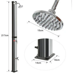 [UTILISATION FLEXIBLE] La douche peut être utilisée dans les jardins, sur les terrasses, dans les piscines et même lors de voyages en camping-car, etc. Profitez de la possibilité de vous rafraîchir quand vous le souhaitez et de passer l’été au frais. Le pommeau de douche pivotant, la douchette et le robinet de pied sont d’autres points forts de notre douche solaire.