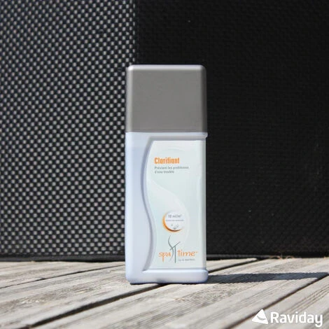 Clarifiant Application Il est d’ordinaire impossible de filtrer les impuretés les plus fines. Le Clarifiant SpaTime a donc pour effet de combiner ces impuretés à des particules plus grosses et de rendre ainsi sa clarté à l’eau. Les PLUS produit • Convient à tout type de filtres, particulièrement adapté aux filtres à cartouche • Augmente l’efficacité de la filtration • Diminue la consommation de produits de désinfection • Agit indépendamment de la température de l’eau ou de la méthode de désinfection. Description Produit Liquide bleu clarifiant concentré Prévient les problèmes d’eau trouble Recommandations / Dosage Ajouter la quantité nécessaire de Clarifiant non dilué une fois par semaine directement dans l’eau du spa, filtration en fonctionnement. Après l’ajout, laisser tourner la filtration pendant au moins deux heures. Si l’eau est toujours trouble après 36 heures, il s’agit d’une pollution organique. Celle-ci ne peut être éliminée que par l’augmentation de la quantité de chlore en ajoutant un sachet de Désinfectant Plus. Dosage : 10 ml par m³ par semaine. Conseil : Avant le dosage, il faut contrôler le pH à l’aide des Bandelettes 5 analyses SpaTime et l’ajuster si nécessaire entre 7,0 – 7,6. Cette action est indispensable pour garantir que le produit Clarifiant ait un effet optimal.
