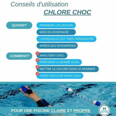 – Chloration Choc (eau trouble / verte / présence d’algues) : 7 à 10 pastilles pour 10m³ dans le skimmer, filtration en marche forcée