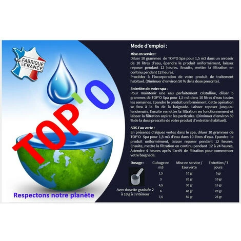 En présence d’algues vertes dans le spa, diluer 10 grammes de TOP’O Spa pour 1,5 m3 d’eau dans 10 litres d’eau. Epandre le produit uniformément, laisser reposer pendant 12 heures. Ensuite, mettre la filtration en continu pendant 12 à 24 heures, Attendre 4 heures après l’arrêt de filtration pour commencer votre baignade.