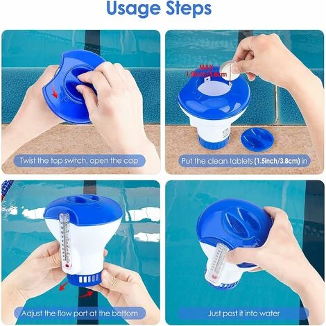 Facile à utiliser : il suffit d’ouvrir le couvercle et d’ajouter lentement des pastilles de chlore, d’ajuster la sortie d’eau et de la mettre dans la piscine.