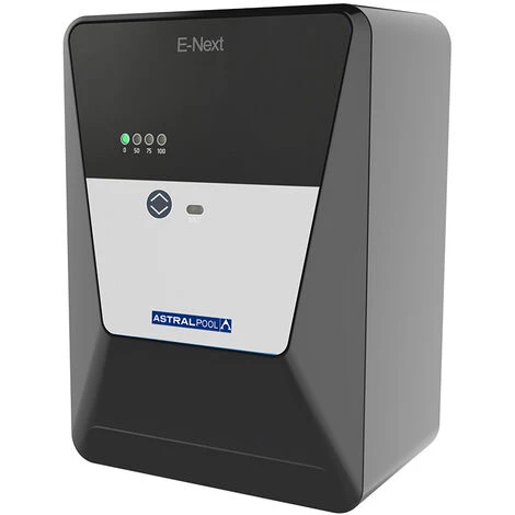 Electrolyseur au sel E-Next 12 – Astral PoolUn concentré de technologieLe design compact de l’E-Next lui permet d’être installé dans la plupart des locaux techniques, même les plus humides grâce à son co