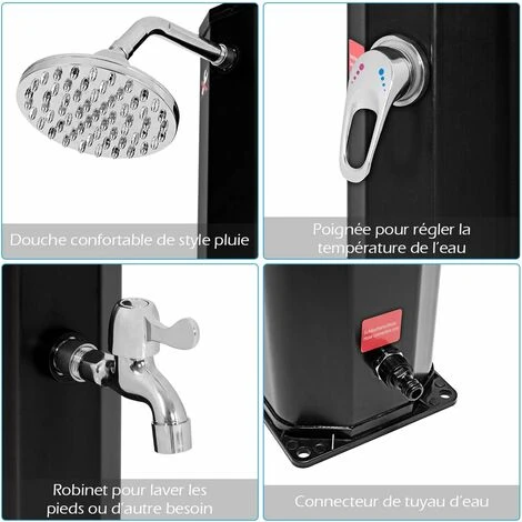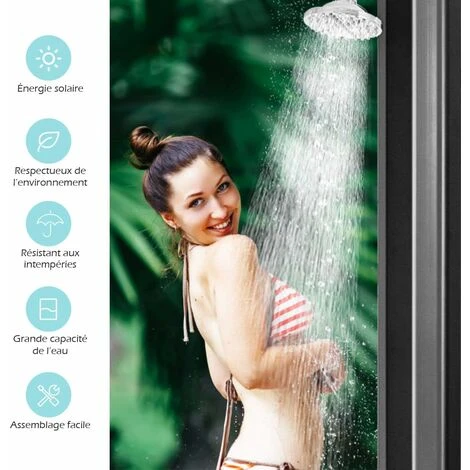 - L’été approche et vous avez besoin d’une douche extérieur ? Notre douche est le produit qu’il vous faut. Il absorbe l’énergie solaire et permet de chauffer l’eau du réservoir. Sa capacité de 35L vous offre une parfaite expérience de bain ! Un robinet est inclus pour répondre à d’autres besoins. Avec sa conception élégante et moderne, cette douche est idéale à côté d’une piscine dans un jardin.